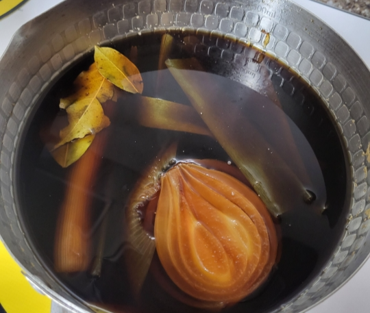 3. 간장 ,물 ,미림,올리고당 , 설탕 , 파, 양파반개 ,월계수잎, 레몬즙